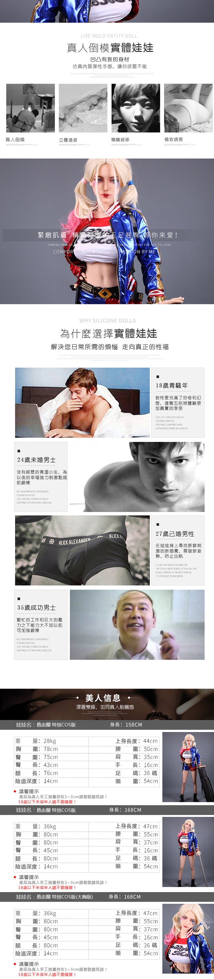 【材料】外皮(皮膚)為高級無毒超軟TPE,內有金屬骨架,四肢的活動範圍與真人類似。