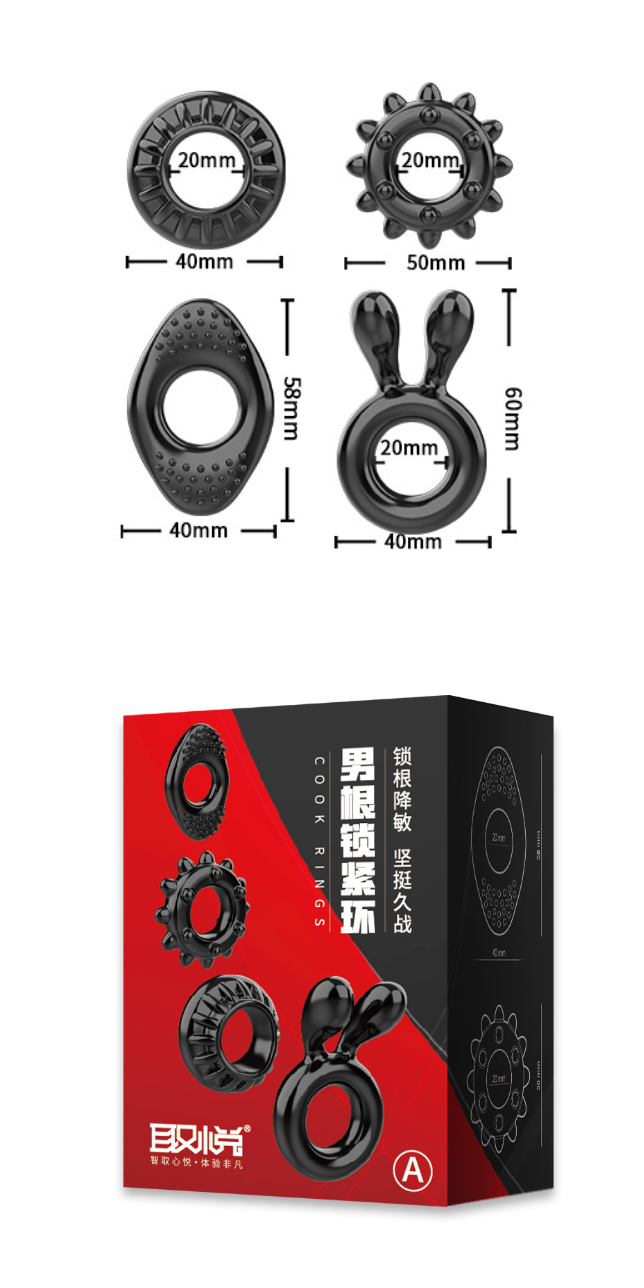 用途:男女情趣之用 材質:TPE 規格:安全設計/手動型/4入 淨重:約48g 總重:約66g 尺寸:4款內徑皆約2cm(詳見圖示) 外盒尺寸:10.1x7.3x5.3cm 注意:請與潤滑液共用.並保存於陰涼處,欲重覆使用.用後清水沖洗。 ※情趣用品屬於個人衛生用品,經拆封使用,無法接受退換貨!※ ※每台電腦的解析度皆不同,可能有些微色差,顏色皆以實品為主!※