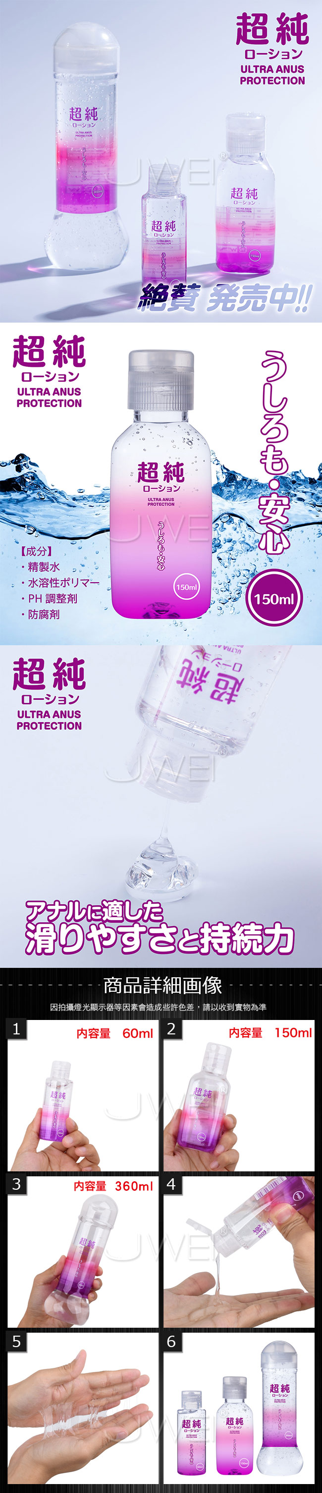 アナルプレイ用に開発された「超純ローション」シリーズのアナルバージョンです。このウルトラエイナスは、トロンとしたポッテリな使用感だから、アナルグッズにも長時間留まります。また、超壁にも長時間留まるので、デリケートな内部を傷付ける心配はありません。滑りとヌルヌルが長時間持続するので、バツグンの使い心地です。無色無臭の透明なタイプのローションで、手に取るとこってりまとまりのある質感です。アナルプレイ用のローション選びに迷ったらコレで決まり!