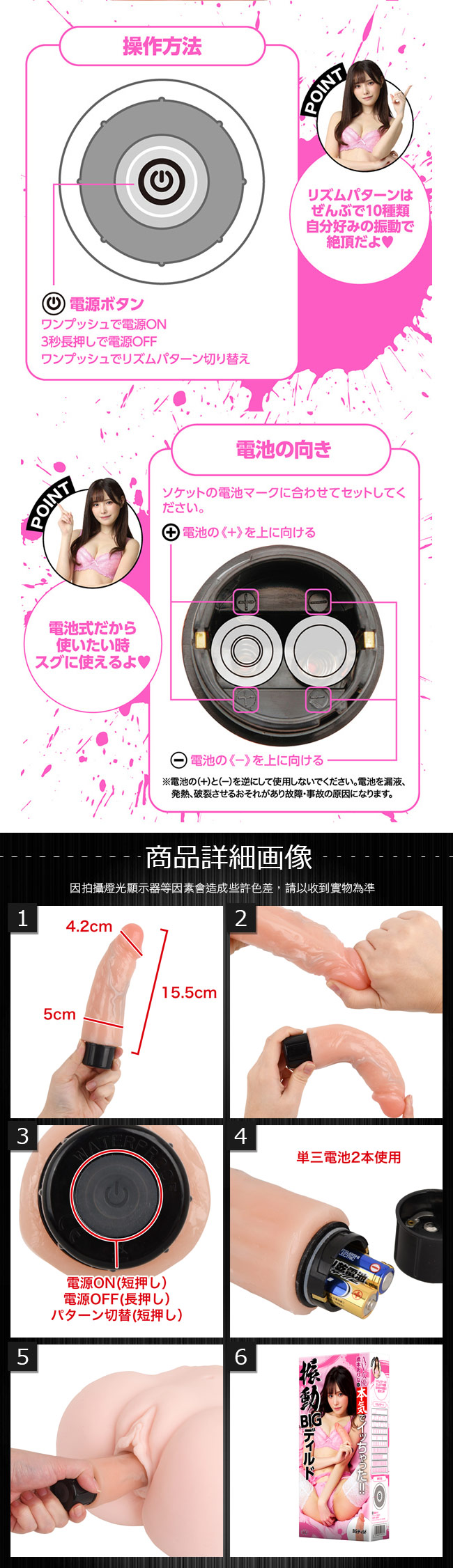 先端直径が約4.2cmの極太タイプ、ズルムケ仕様のリアルデザインのバイブレーター。 また、最大約8mmのカリ高で内部をゴリゴリ掻き乱します。 10種類の振動パターンと手に痺れを感じる程の超強力モーターを搭載。 「BIGサイズxパワフルモーター」でギャンギャン鳴かし絶頂に導きます。 使いやすさを重視したワンプッシュ式コントローラーなのでストレスフリーでイカせの、リアルプレイが楽しめます。
