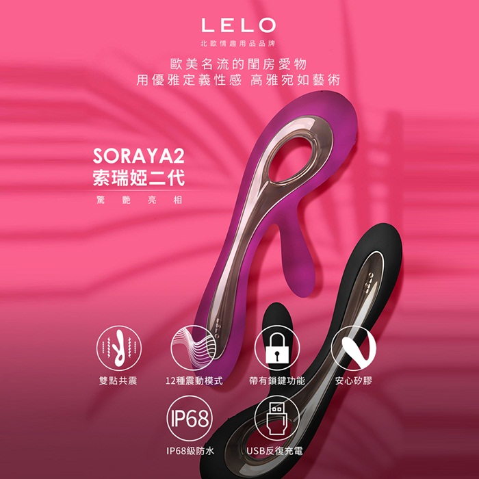 Soraya是世界上最美麗的雙重功能振動器,她時尚而極具誘惑的設計為您帶來多重愉悅。她光滑流暢的外部線條配以兩個靈活的獨立馬達,喚醒身體中的每個激情點,旨在為您帶來最奢華的愉悅享受。Soraya是由安全矽膠製成,核心為鉑金塗層的ABS環保材質,觸感光滑舒適,Soraya高度防水, 她的8種激情模式通過介面上的3個操作按鈕來控制振動速度和強度。Soraya被放置在LELO奢華的黑色包裝盒裏,代表著LELO最高水準的品質和設計,同時隨盒附帶緞質收納禮袋、特定國家充電器、INSIGNIA胸針和一年品質保證書。