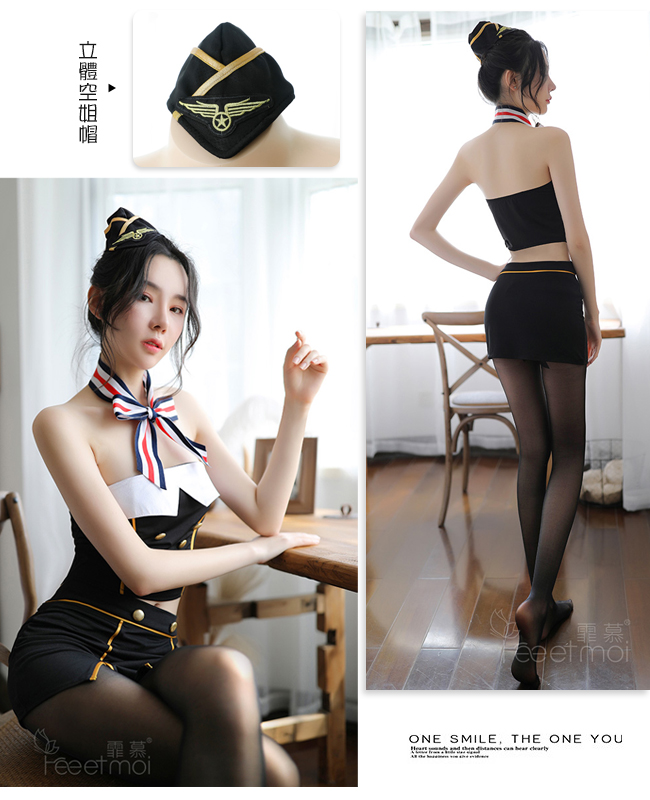►您現在的位置:首頁>俏麗空姐角色扮演服!條紋領巾翻邊平口露腰七件式套裝