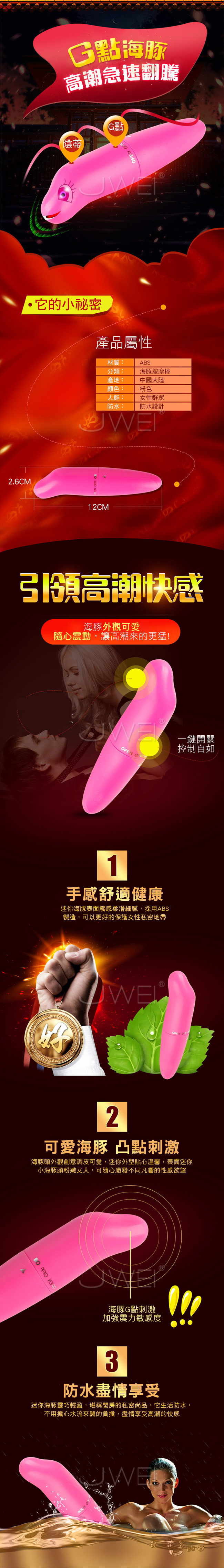 海豚按摩棒外觀可愛,棒身G點凸起高潮急速翻騰隨心震動讓高潮來的更猛!表面觸感柔滑細膩,採用ABS製造,可以更好的保護女性私密地帶。整體小巧輕便,可輕鬆放在包包裡隨身攜帶使用1節3號電池方便簡單!走到哪都能用喔!