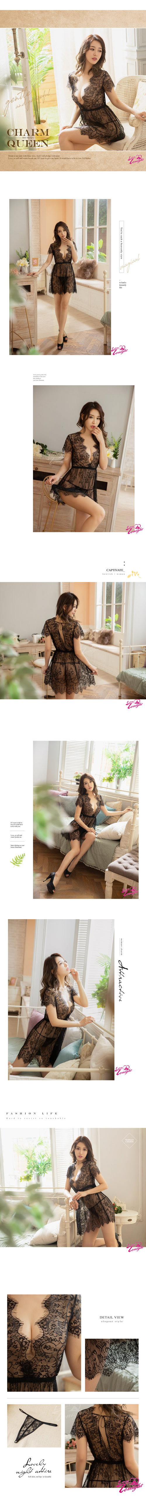 | 迷人黑蕾絲透視深V二件式丁字褲性感睡裙