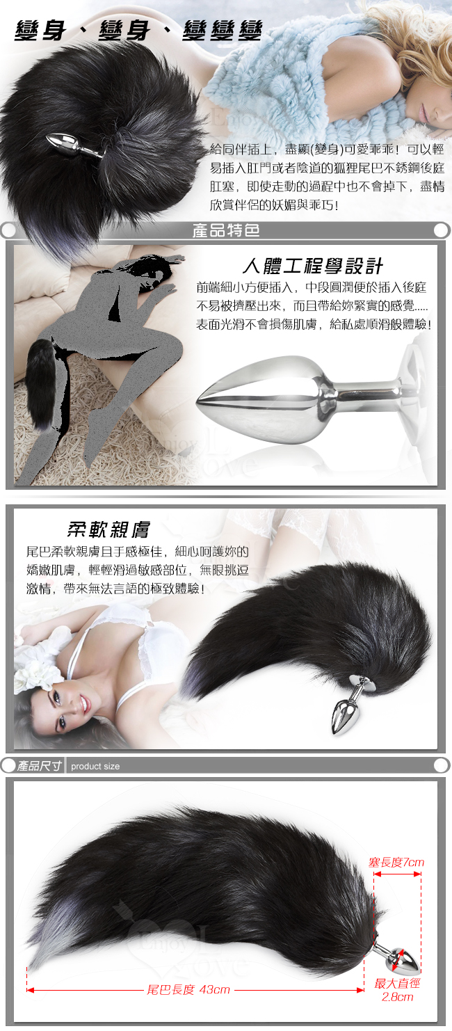 女人狐媚之美,盡在不銹鋼狐尾巴後庭塞! 變身cosplay用具就是這麼神秘,插上肛門塞就變成迷惑狐狸了。 給愛人插上,盡顯狐狸的野性及撫媚!即使走動的過程中也不會掉下,更不用說對此尾巴拉拉扯扯過程中帶來的快感和樂趣...... 快快行動!可以變化的可愛狐狸就是你! 【產品目的】本品是成人遊戲的最佳選擇。體驗另類性愛,增進情趣。 【使用方法】想怎麼玩就怎麼玩!加些潤滑油,慢慢插入肛門或陰道,享受極品性生活。 【顏色規格】小號 (詳如圖) 【產品包裝】超厚款拉鍊收藏袋裝