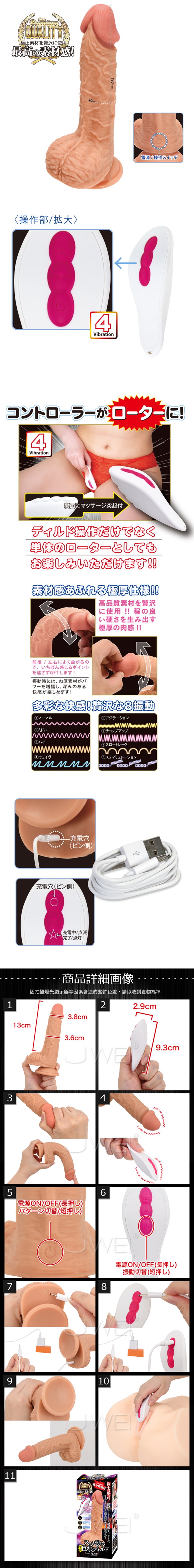 令人滿意的粗壯巨根!帶有8頻震動的逼真棒身!您可以使用遙控器自由玩耍。