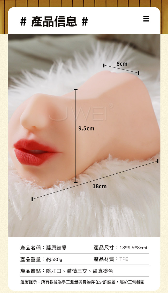 藤原結愛三通道名器,三穴誘惑 ,口愛+陰部+後庭,夠逼真才更盡興;花式玩法,單一的陰肛玩法到陰肌口,三重玩法的綜合,讓你感受別緻體驗;紅唇口交,口愛誘惑,享受口愛帶來的樂趣男人的性福通道之一;逼真私處結構,逼真誘惑讓你欲罷不能,真通 感真觸感真體驗,外軟內彈通道肉感更接近真實,給你體驗人生的更多愉悅方式!