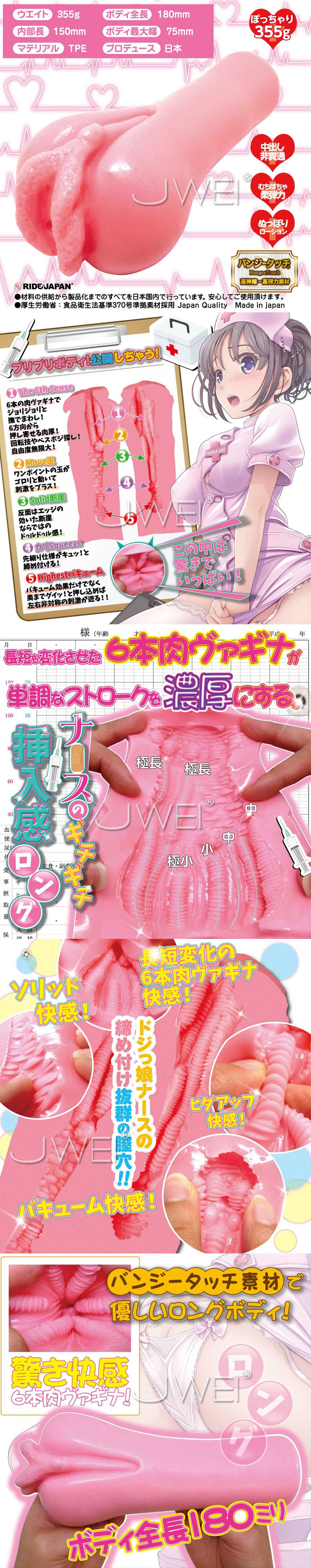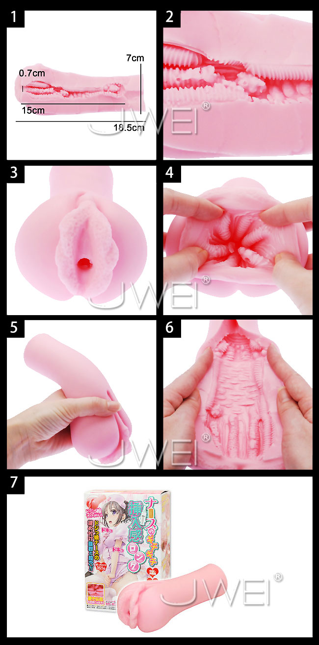 ドジっ娘ナースの締め付け感抜群の膣穴をイメージした、ロングボディのオナホール。 バンジータッチ素材を使用したボディは優しく柔らかな感触で、ビラビラがいやらしく肥大した入り口から挿入すると、長さが異なる6本の肉筋が細かなヒダで 全体をジョリジョリと撫で回し、中腹部分に密集した大粒の肉突起が、コリッとした感触で刺激します。 さらに、すぼまった最深部に進むと、強力に締め付けながら、細かなヒダ突起で亀頭を集中的に擦りまくり、がこれでもかと押し寄せる快感が楽しめます。 ボディを回転させるとまた違った刺激が味わえるので、色々と角度を変えると、様々な変化する快感が楽しめます。