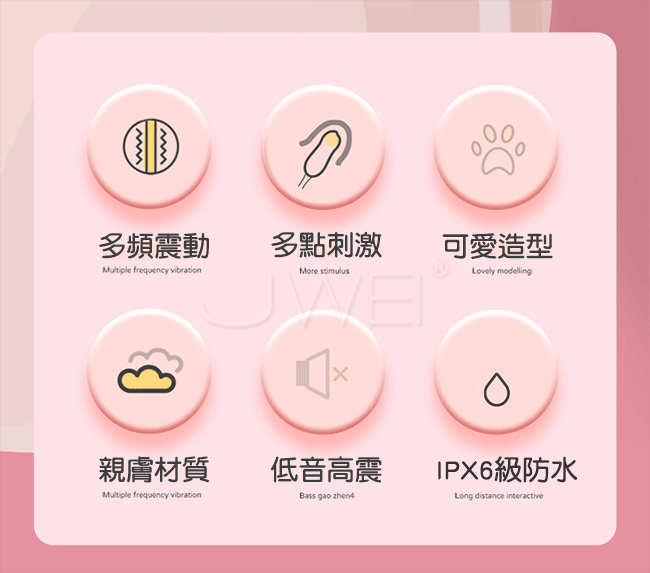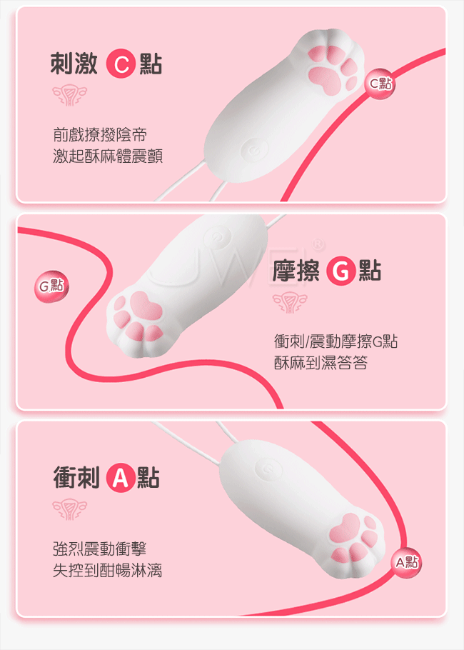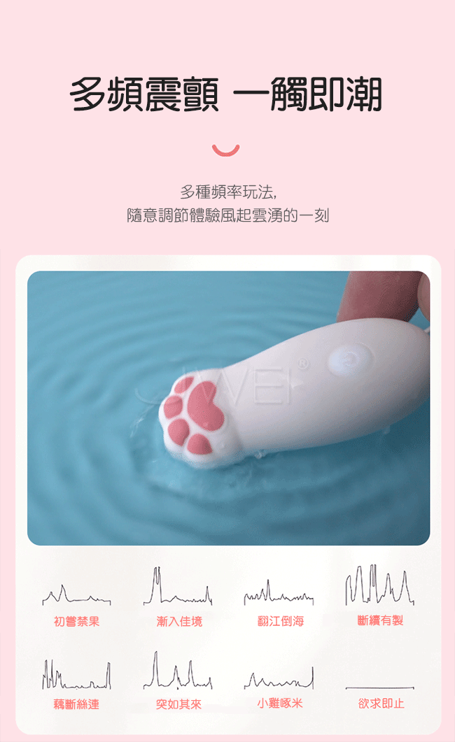 萌寵小跳蛋,激萌上市,小蛋體大能量,引爆多點高潮,照顧到身體的每個敏感點,酥 麻強震,威力馬達,引爆潮爽 實驗C點、G點連續高潮;多頻震顫一觸即潮,多種頻率玩 法,隨意調節體驗風起雲湧的一刻;130秒/次的酥麻震動,從前戲到高潮,內外同潮; 刺激C點,前戲撩撥陰蒂,激起酥麻體震顫;摩擦G點,衝刺/震動摩擦G點,酥麻到濕答 答;衝刺A點,強烈震動衝擊,失控到酣暢淋漓;低音輕噪,宛如情人低語;無需多擔憂 ,縱享春宵一刻;隱形針孔充電,不影響水洗,不破壞蛋體,入體不擔心進液,用後輕 鬆水洗!