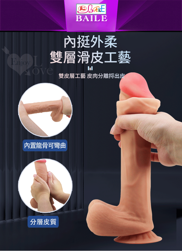 【BAILE】MENDEL 孟德爾 內挺外柔 10.2吋雙層滑皮工藝 仿真膚質吸盤超大老二按摩棒棒-肉色﹝內彎曲龍骨﹞