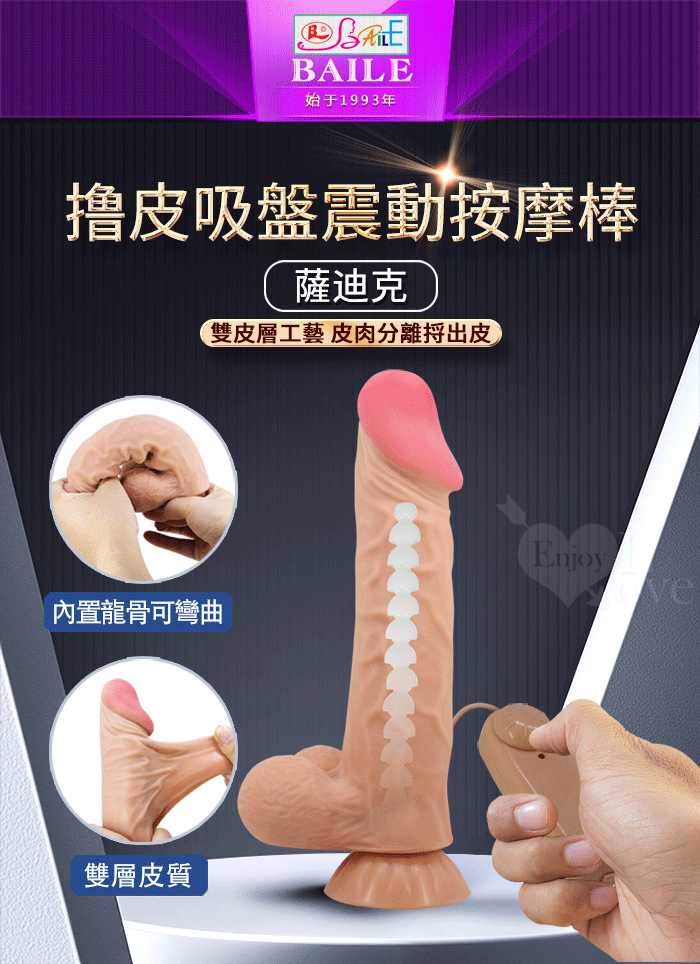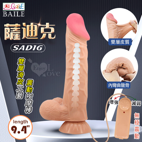 【BAILE】SADIG 薩迪克 無極震動 內挺外柔 9.4吋雙層滑皮工藝 仿真膚質吸盤粗大老二按摩棒﹝內彎曲龍骨﹞