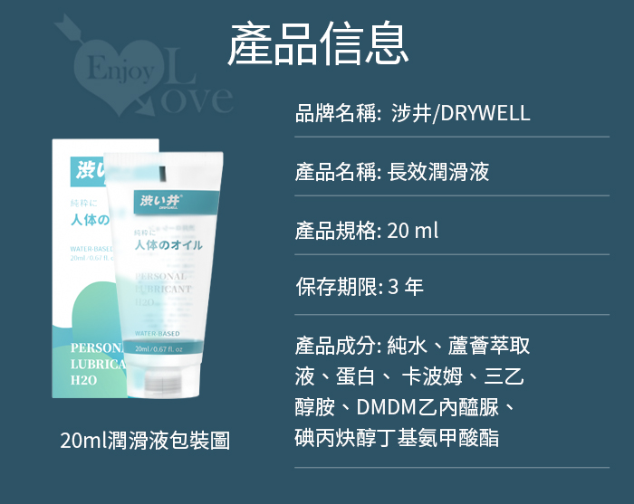 【適 用】性交、肛交、乳交、口交、性用品上。 【規 格】20ml / 瓶,體積長不到8公分,最適合外出/度假/蜜月/隨身常備。 【生產日期】標印於包裝盒上 【保存期限】三年,請儲存請置於陰涼乾燥處。 【用法及用量】長效潤滑~愛愛前戲前,擠出液體塗於陰道、後庭、男性陰莖或用品器具上,可根據自身情況調整用量。