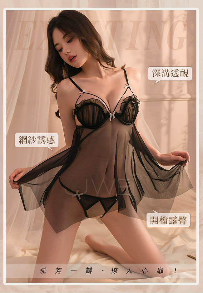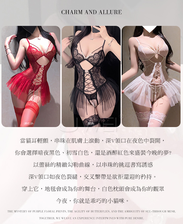 ►您現在的位置:首頁>串珠織夢.深V珍珠飾胸蕾絲繫帶花邊裙擺開襠連體衣【黑色】